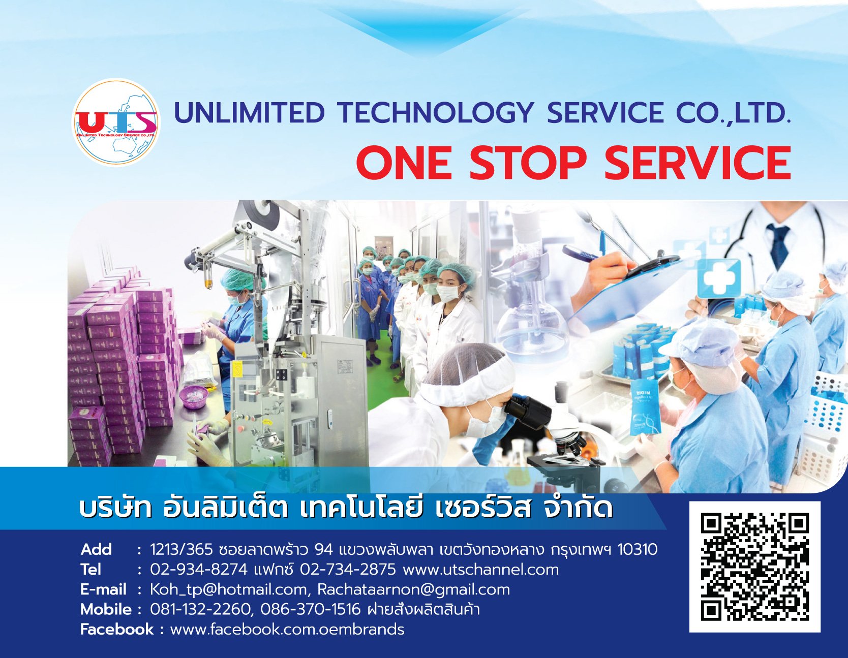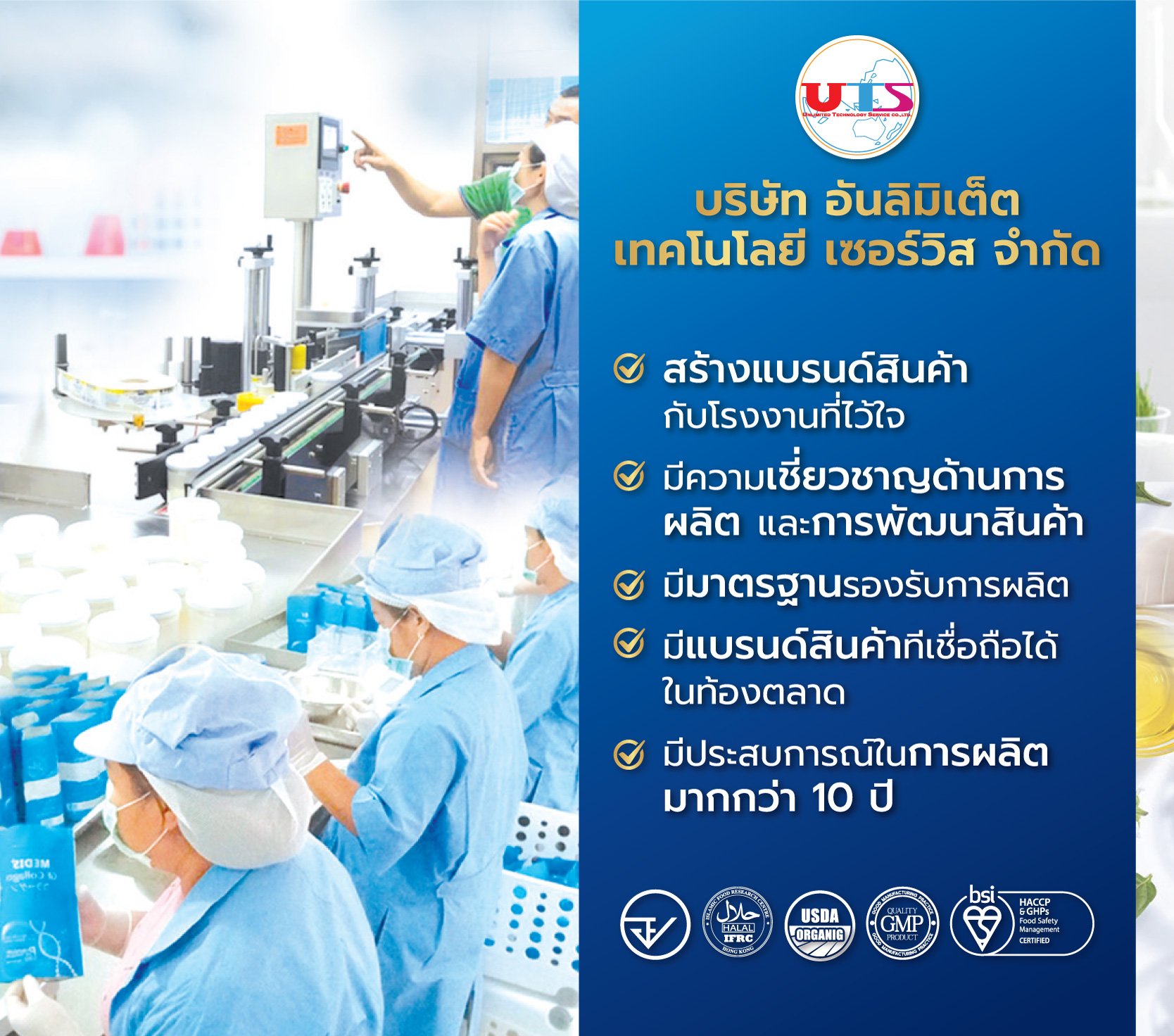 บริษัท อันลิมิเต็ต เทคโนโลยี เซอร์วิส จำกัด ดำเนินธุรกิจด้านการผลิต ผลิตภัณฑ์เสริมอาหาร รับผลิตอาหารเสริม และเครื่องสำอางค์ และเป็นผู้ค้นคว้า พัฒนาสูตรผลิตภัณฑ์ใหม่ ๆ ภายใต้ปรัชญาการดำเนินธุรกิจ “ วัตถุดิบดี สูตรดี งานวิจัยดี คุณภาพดี ” และนโยบายคุณภาพขององค์กรคือ “ ผลิตและพัฒนาผลิตภัณฑ์ ที่สะอาด ปลอดภัย และมีคุณภาพมาตรฐานสากล ”