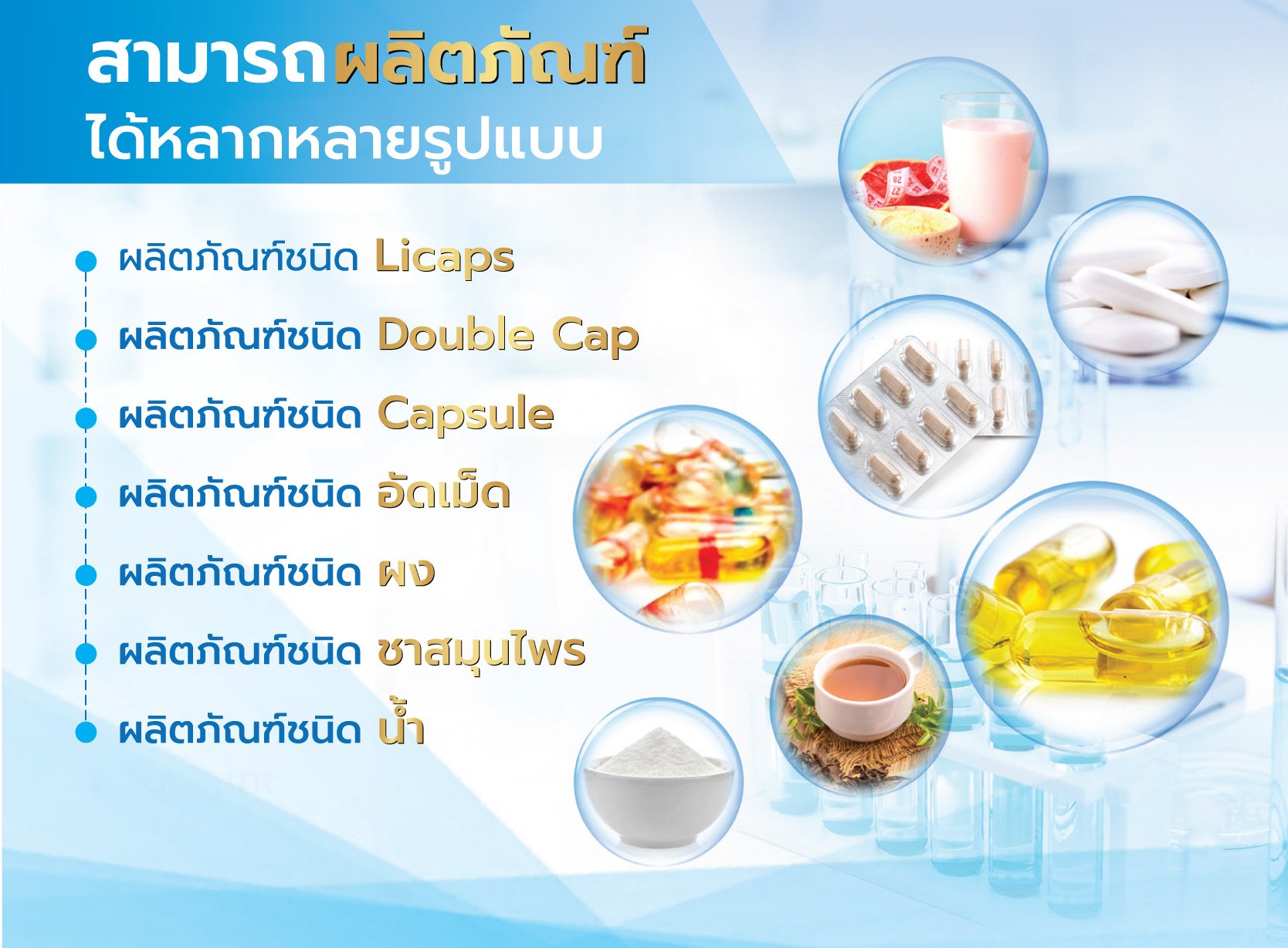 การผลิตรองรับการผลิตสินค้าประเภทอาหารเสริมชนิดพร้อมดื่ม รูปแบบน้ำ เช่นการผลิต คลอโลฟิลด์ ชนิดน้ำ เครื่องดื่มบิวตี้ดริ้ง เครื่องดื่มสมุนไพรชนิดน้ำ โดยระบบน้ำที่ใช้ผ่านการผลิต ผ่านระบบการฆ่าเชื้อตามมาตรฐาน และมีระบบกรองละเอียด เพื่อให้เครื่องดื่มปราศจากสารตกตะกรอน